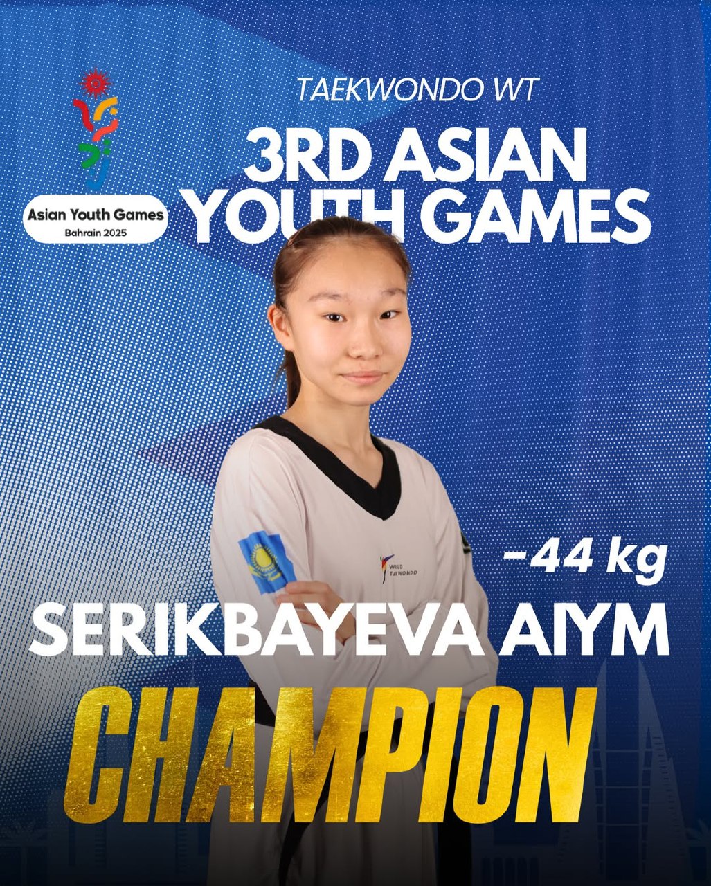 Спортсменка Дворца единоборств им. Жаксылыка Ушкемпирова РГКП «Центр олимпийской подготовки по видам борьбы» Серикбаева Айым стал обладателем золотой медали в весовой категории -44 кг по таеквондо WT.