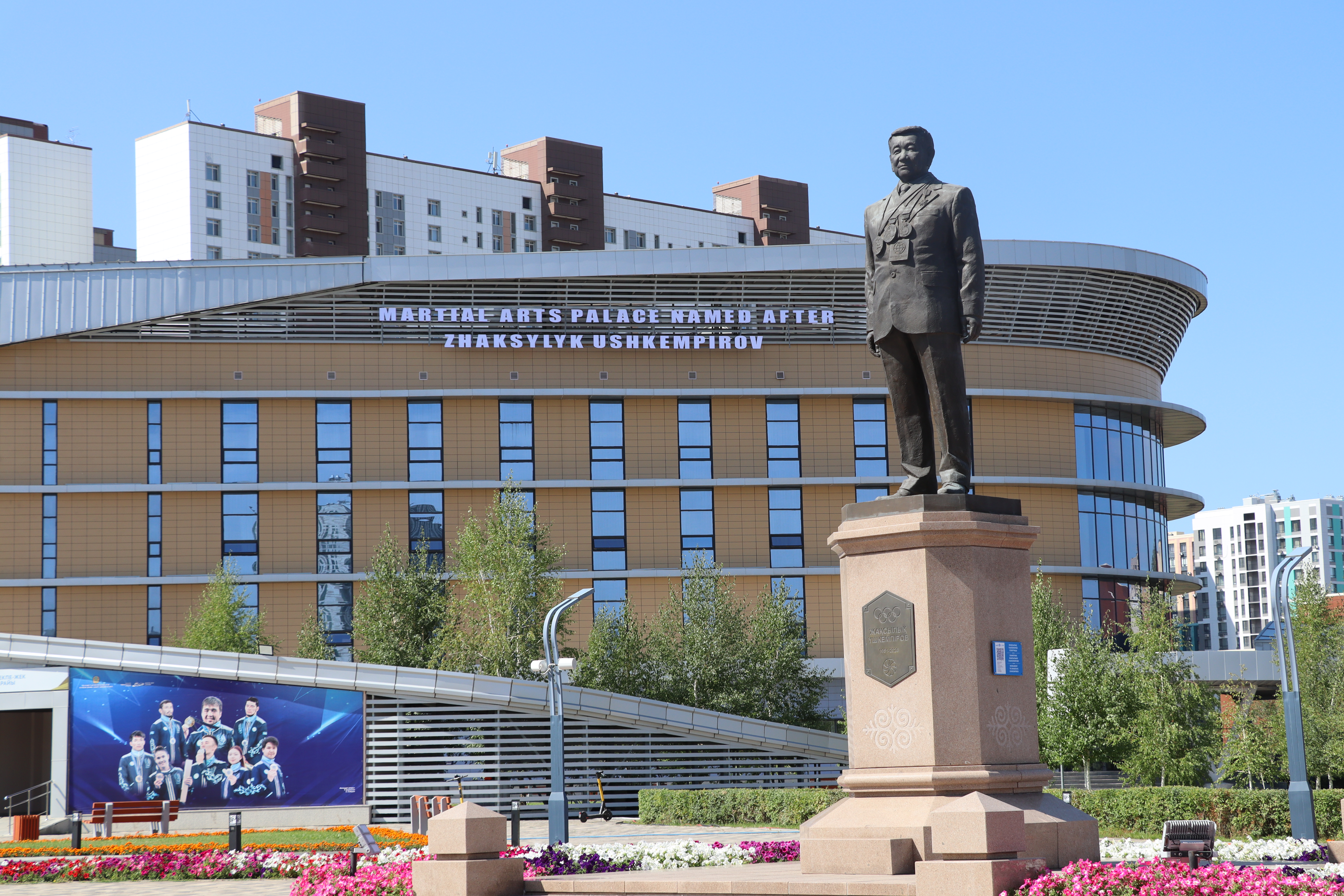 Жақсылық Үшкемпіров атындағы Жекпе-жек сарайы Есіл өзенінің сол жағалауында Қабанбай батыр даңғылы, 43 мекен-жайында орналасқан. Сарай тек жекпе-жек (грек-рим, еркін, әйелдер күресі, дзюдо, таэквондо, каратэ) ғана емес, басқа да спорт түрлері бойынша халықаралық спорт жарыстарын өткізу мүмкіндігі бар бірегей спорт кешені болып табылады.